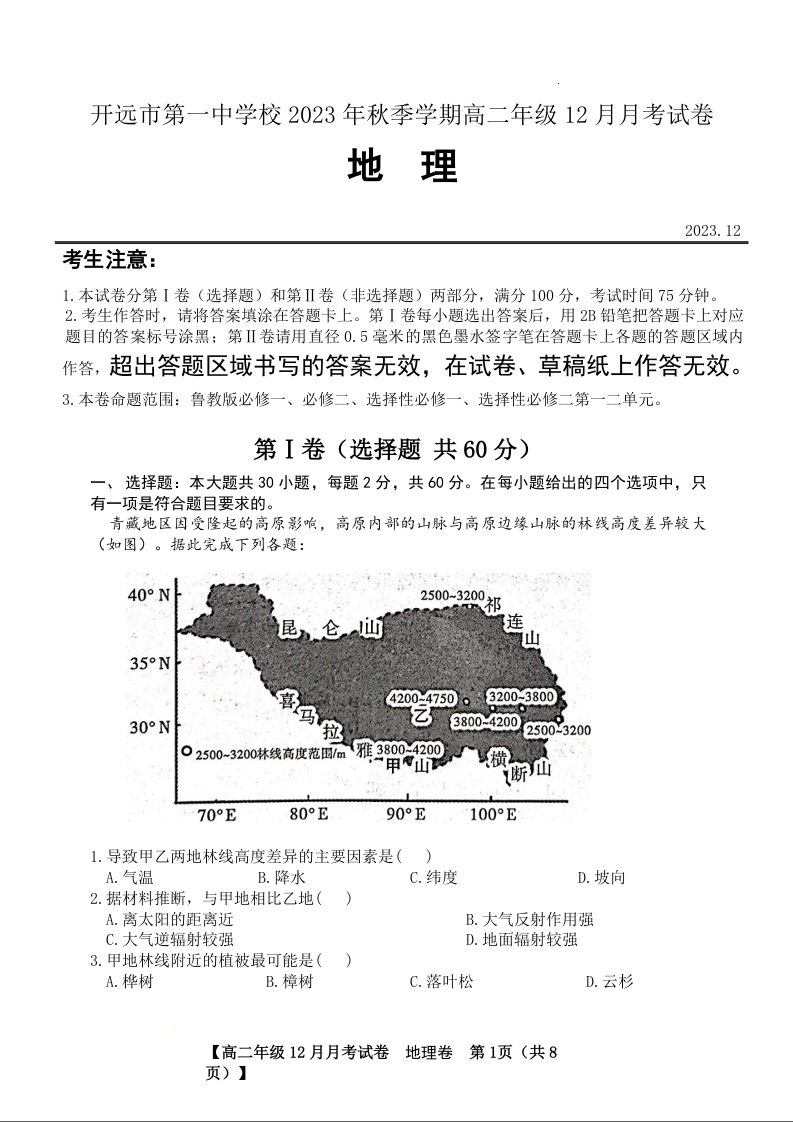 云南省开远市第一中学校2023-2024学年高二上学期12月月考地理
