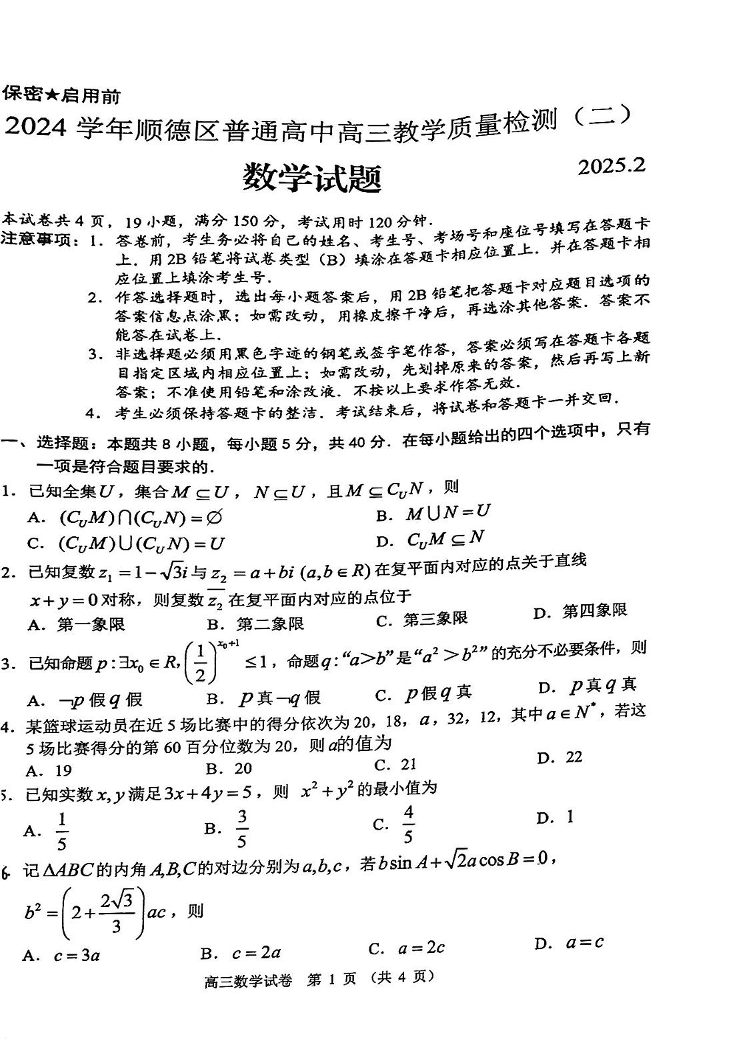 广东省佛山市顺德区2024-2025学年下学期高三教学质量检测(二)数学