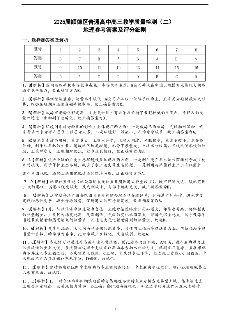 广东省佛山市顺德区2024-2025学年下学期高三教学质量检测(二)地理答案