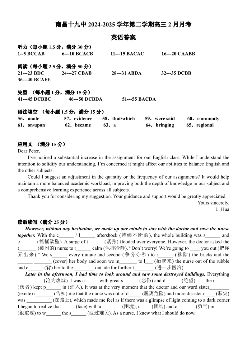 江西省南昌市第十九中学2024-2025学年下学期2月高三月考测试英语答案