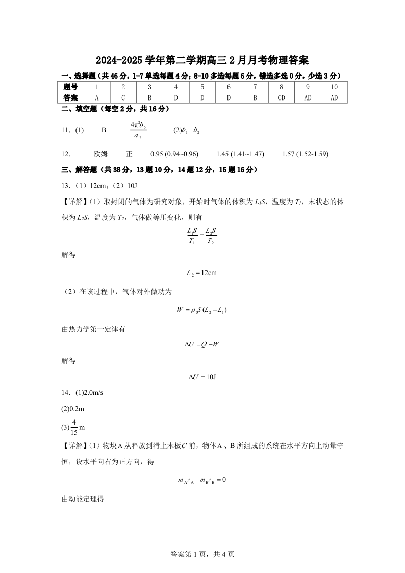 江西省南昌市第十九中学2024-2025学年下学期2月高三月考测试物理答案