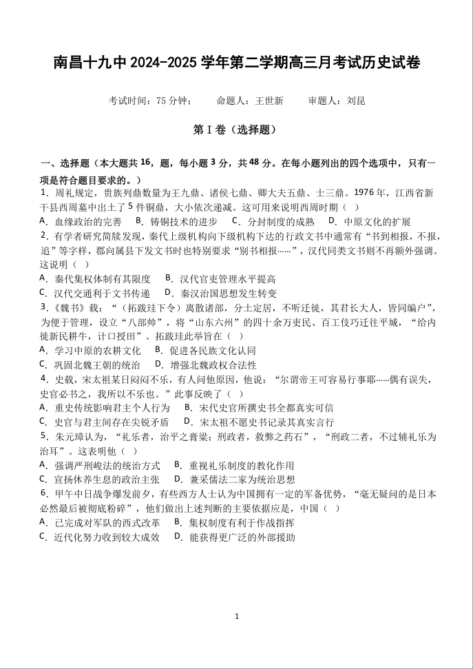 江西省南昌市第十九中学2024-2025学年下学期2月高三月考测试历史