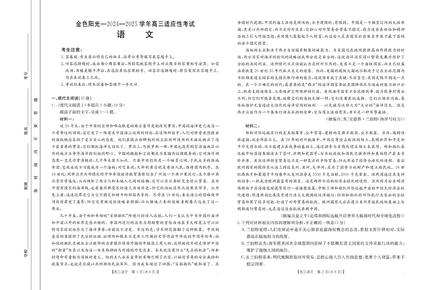 浙江省金色阳光2024-2025学年下学期2月高三适应性考试语文