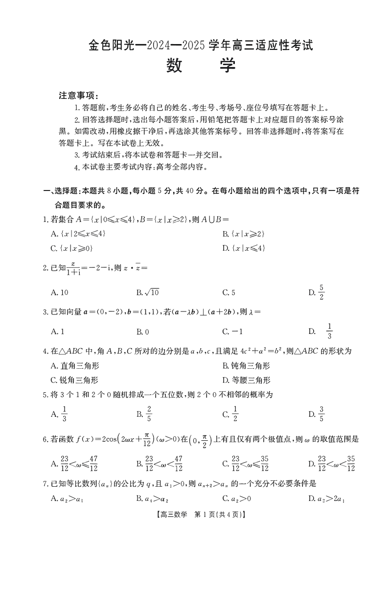 浙江省金色阳光2024-2025学年下学期2月高三适应性考试数学