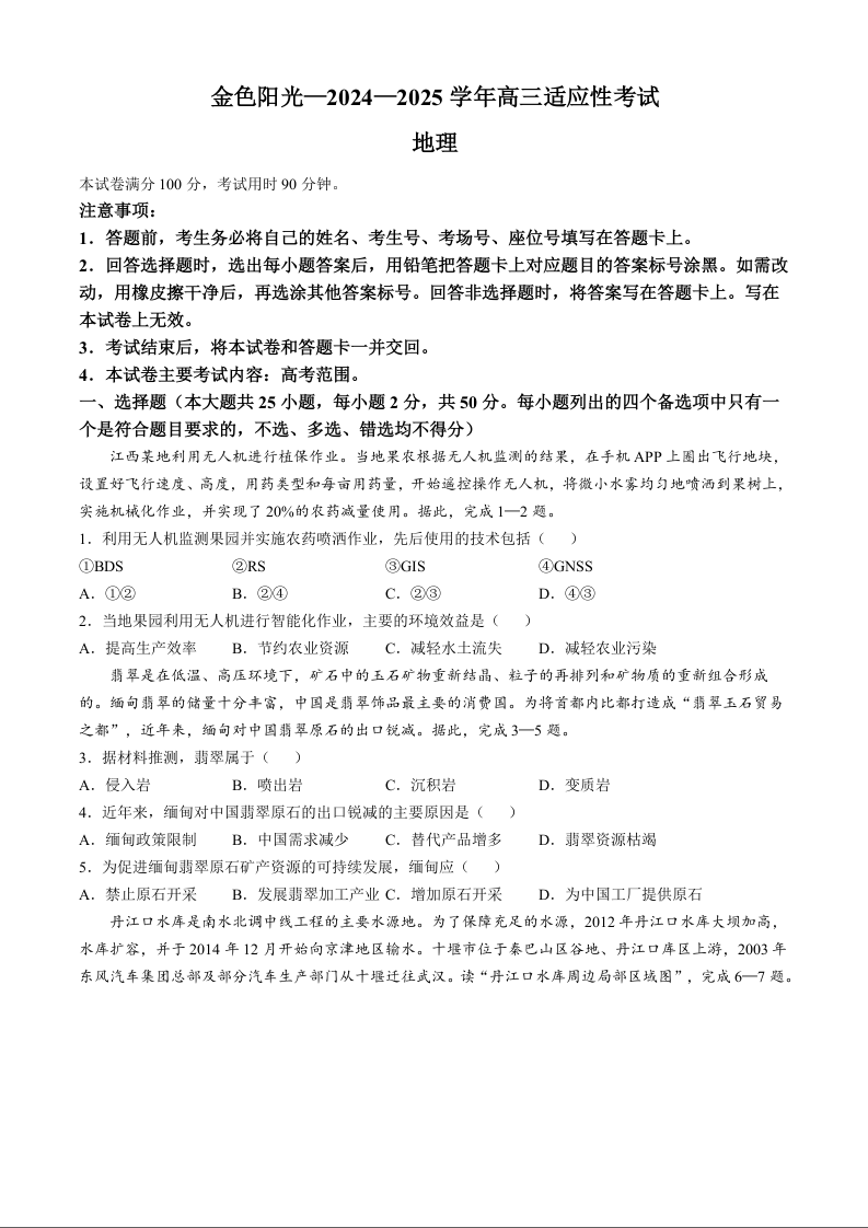 浙江省金色阳光2024-2025学年下学期2月高三适应性考试地理+答案