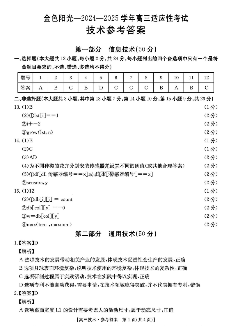浙江省金色阳光2024-2025学年下学期2月高三适应性考试技术答案