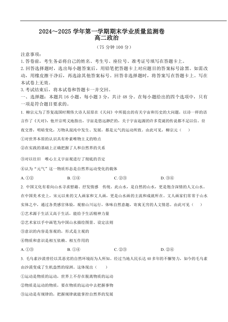 甘肃省区域高中2024-2025学年上学期高二期末考试政治+答案