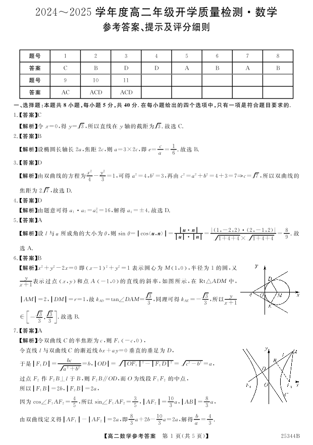 河南省开封市五县联考2024-2025学年下学期高二开学质量检测数学答案
