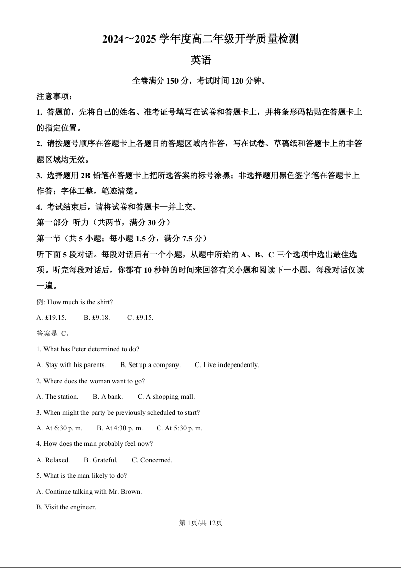 河南省开封市五县联考2024-2025学年下学期高二开学质量检测英语(原卷版)