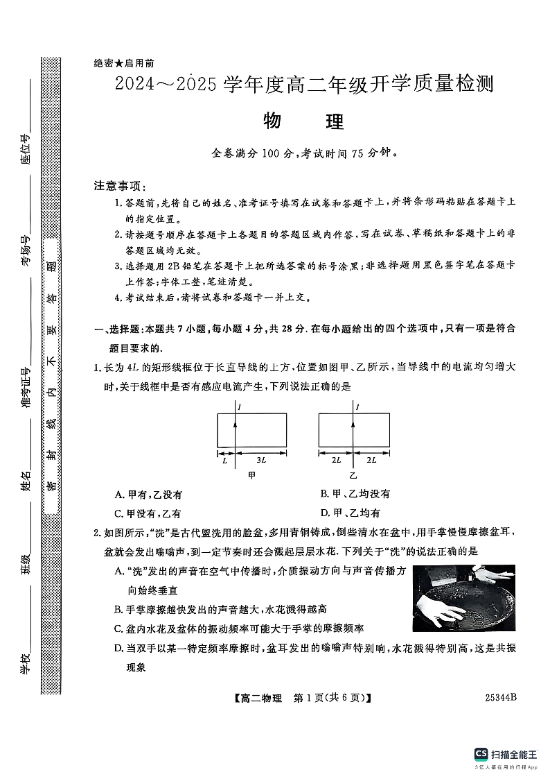 河南省开封市五县联考2024-2025学年下学期高二开学质量检测物理