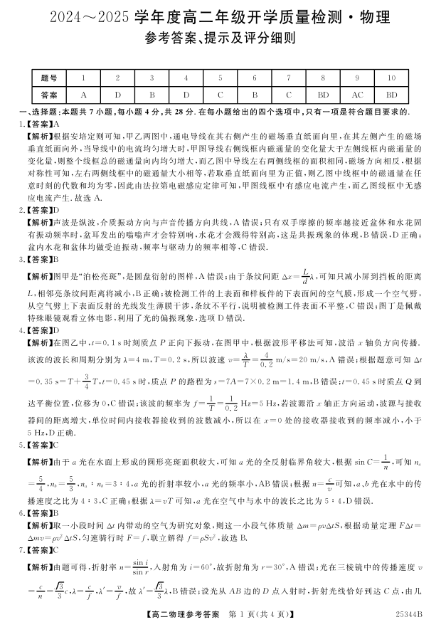 河南省开封市五县联考2024-2025学年下学期高二开学质量检测物理答案