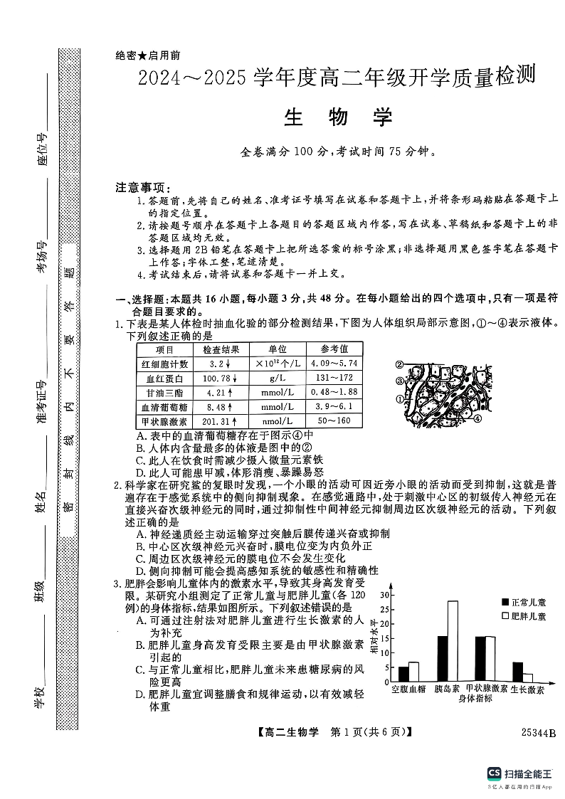 河南省开封市五县联考2024-2025学年下学期高二开学质量检测生物