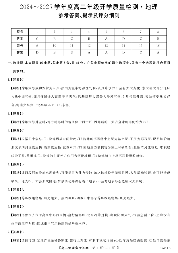河南省开封市五县联考2024-2025学年下学期高二开学质量检测地理答案
