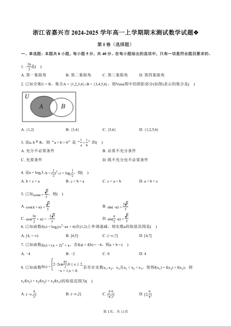 浙江省嘉兴市2024-2025学年上学期1月高一期末检测数学+答案