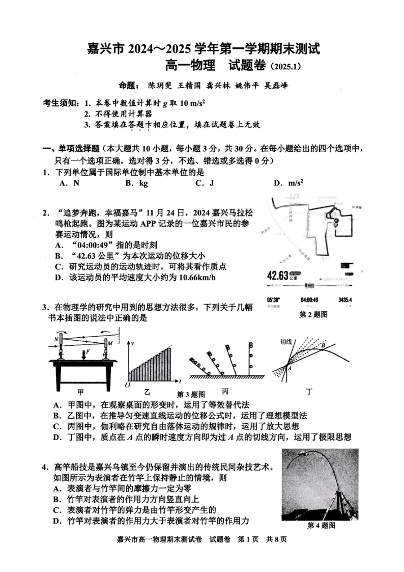 浙江省嘉兴市2024-2025学年上学期1月高一期末检测物理+答案