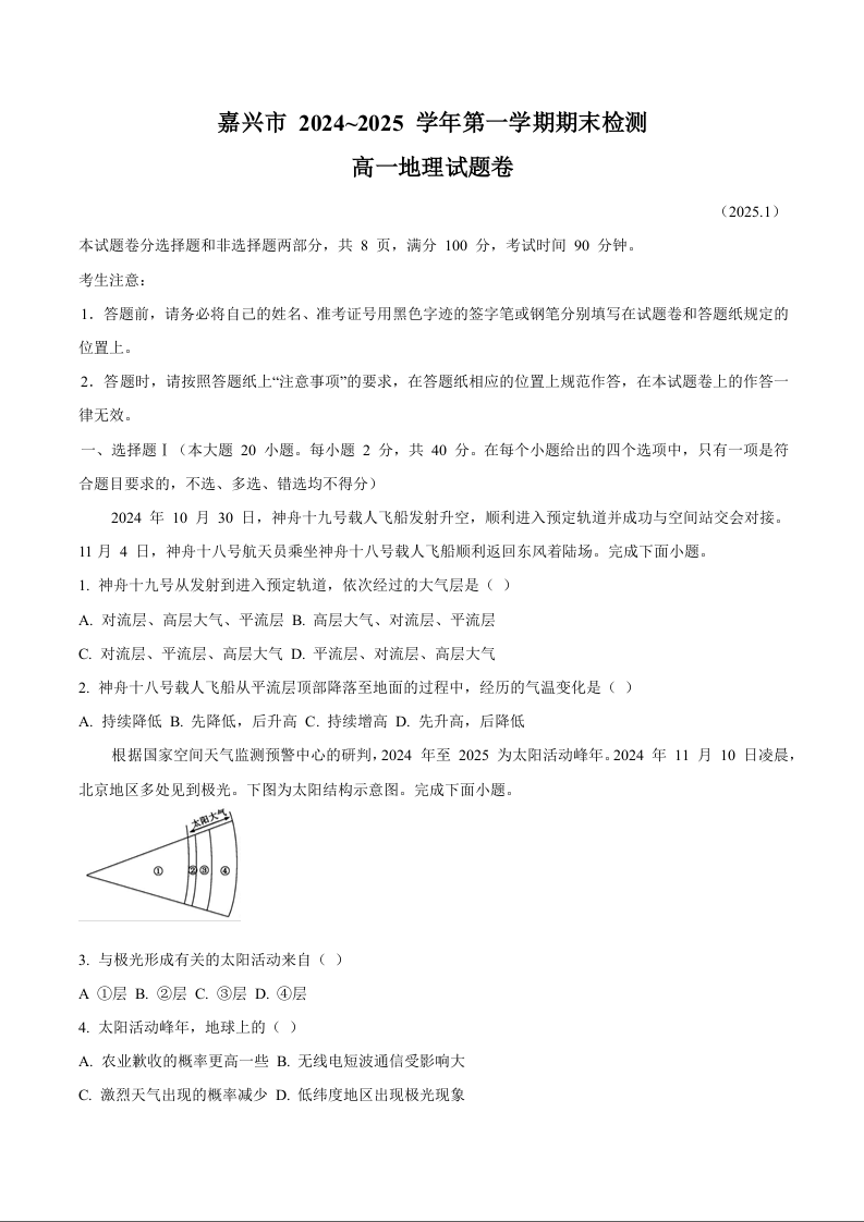 浙江省嘉兴市2024-2025学年上学期1月高一期末检测地理+答案
