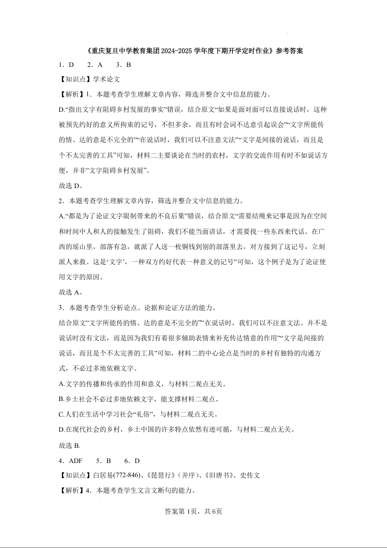 重庆市复旦中学教育集团2024-2025学年下学期高一开学定时作业语文答案
