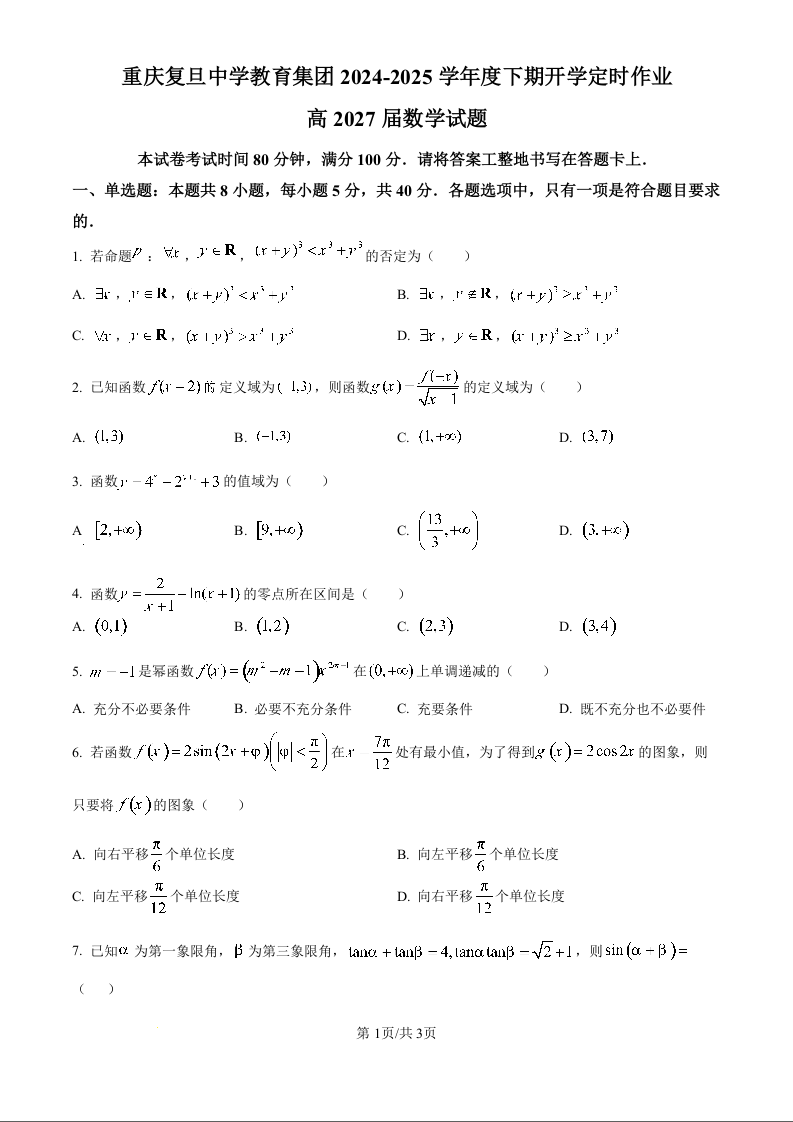 重庆市复旦中学教育集团2024-2025学年下学期高一开学定时作业数学(原卷版)