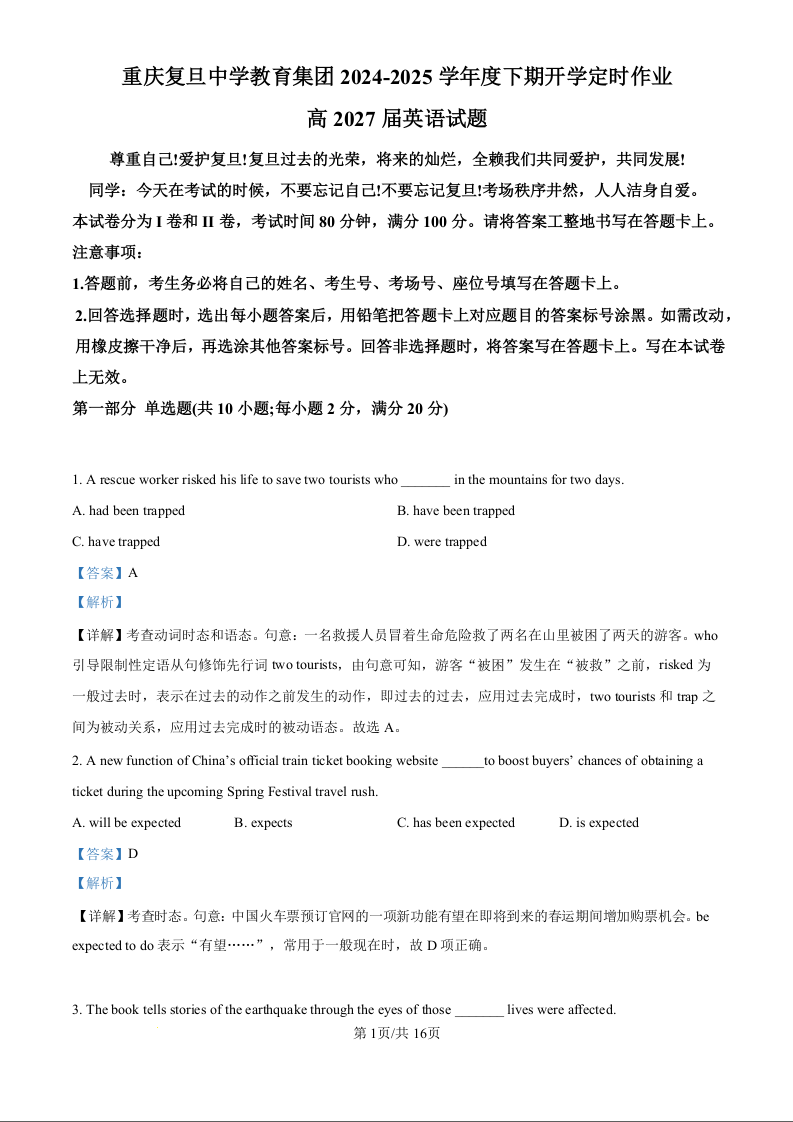 重庆市复旦中学教育集团2024-2025学年下学期高一开学定时作业英语(精品解析版)