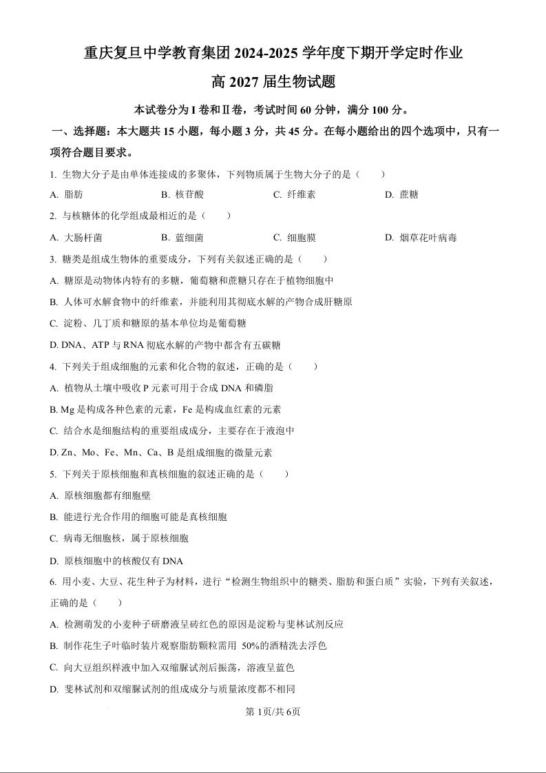重庆市复旦中学教育集团2024-2025学年下学期高一开学定时作业生物(原卷版)