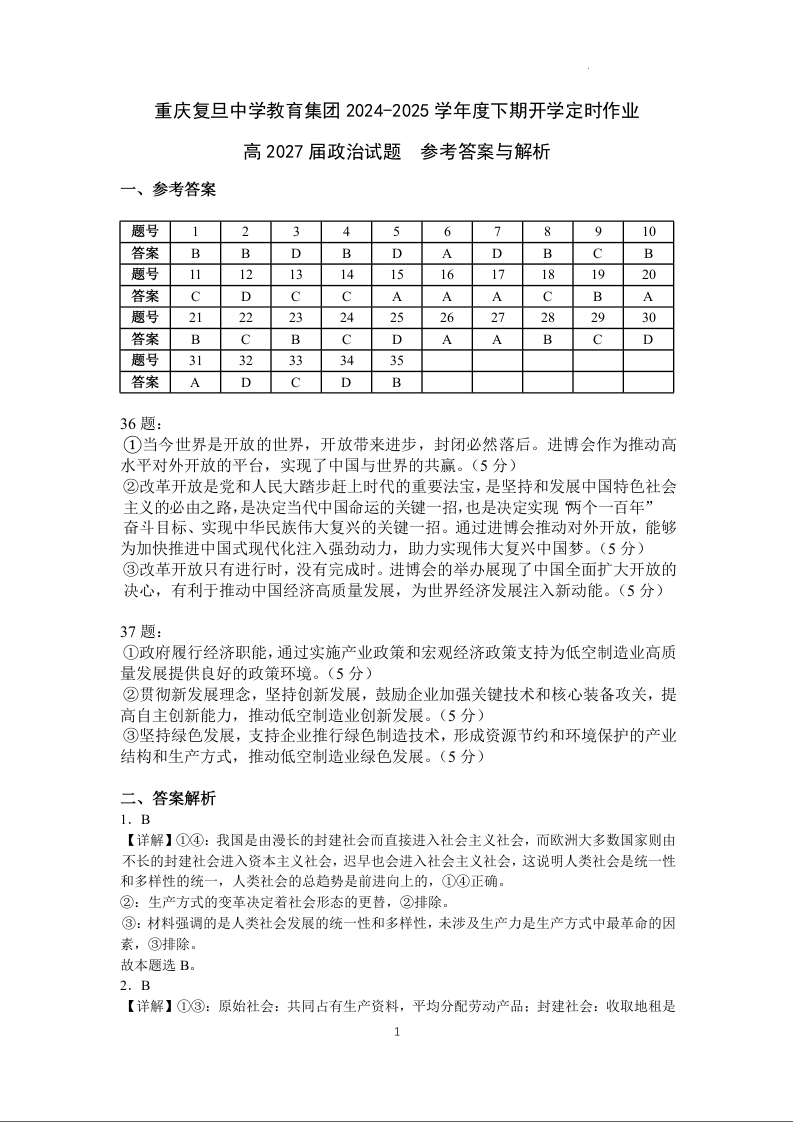 重庆市复旦中学教育集团2024-2025学年下学期高一开学定时作业政治答案