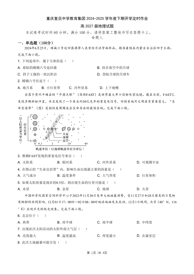 重庆市复旦中学教育集团2024-2025学年下学期高一开学定时作业地理