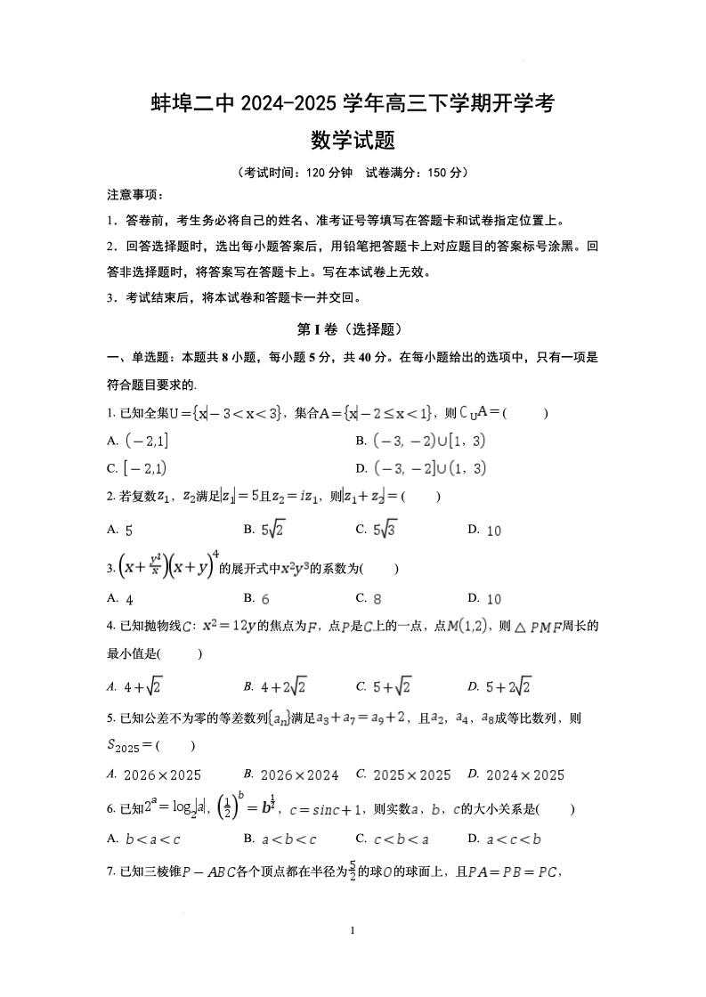 安徽省蚌埠第二中学2024-2025学年下学期高三开学考试数学(原卷版)