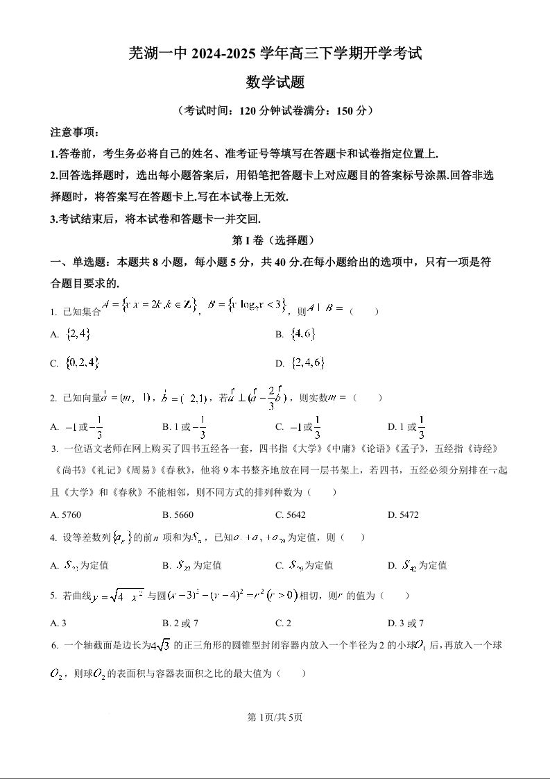安徽省芜湖市第一中学2024-202学年下学期高三开学考试数学(原卷版)