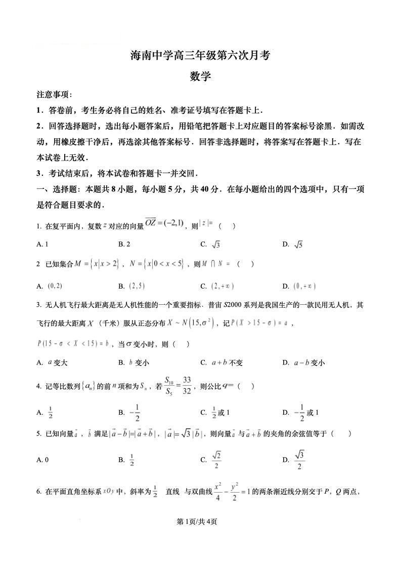 海南省海南中学2024-2025学年下学期高三第六次月考数学数学