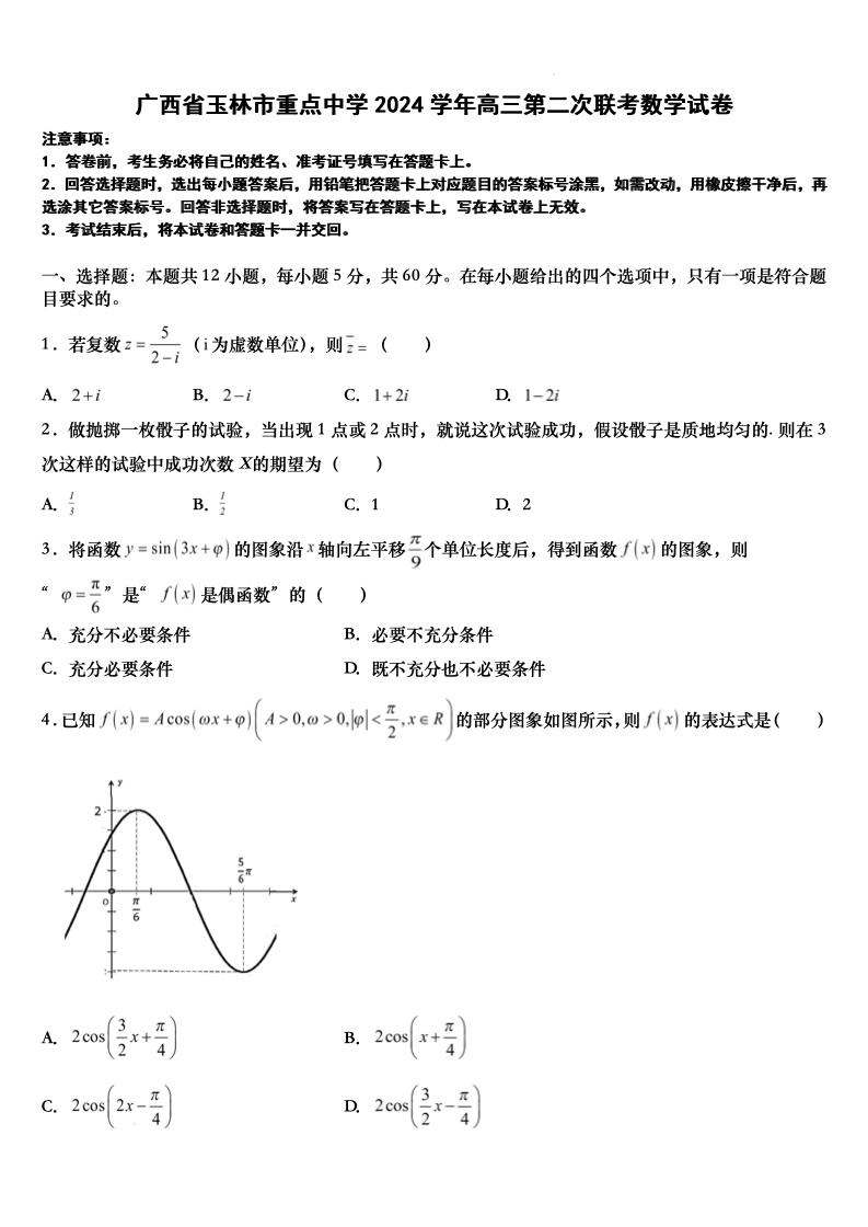 广西壮族自治区玉林市重点中学2024-2025学年高三第二次联考数学+答案