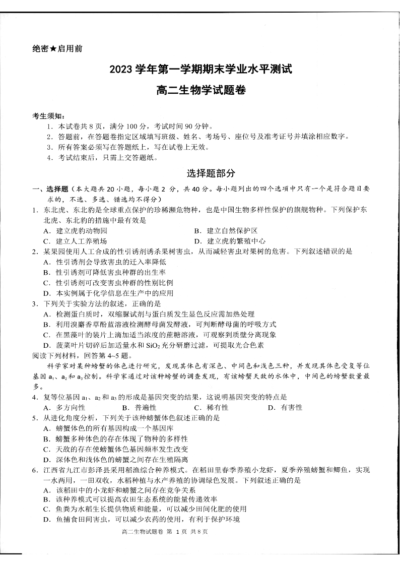 浙江省杭州市2023-2024学年高二上学期期末考试生物