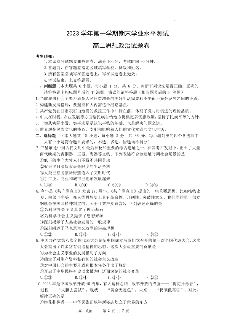 浙江省杭州市2023-2024学年高二上学期期末考试政治