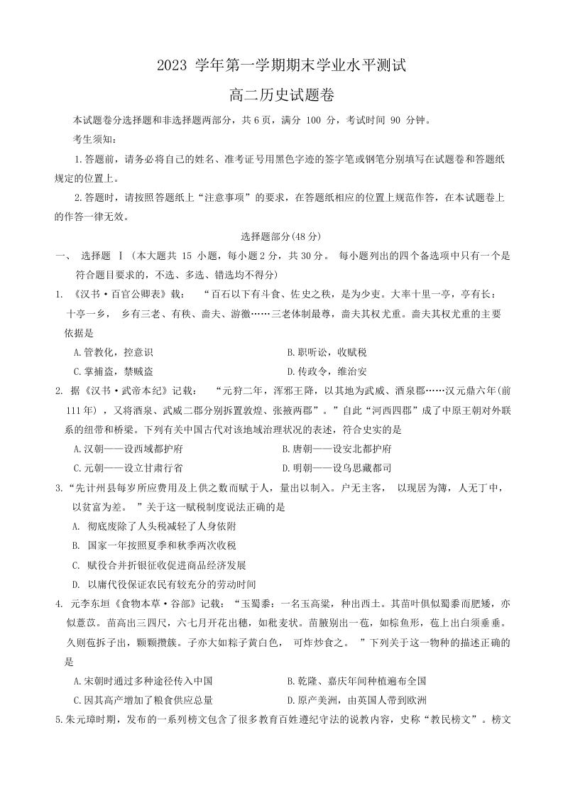 浙江省杭州市2023-2024学年高二上学期期末考试历史+答案