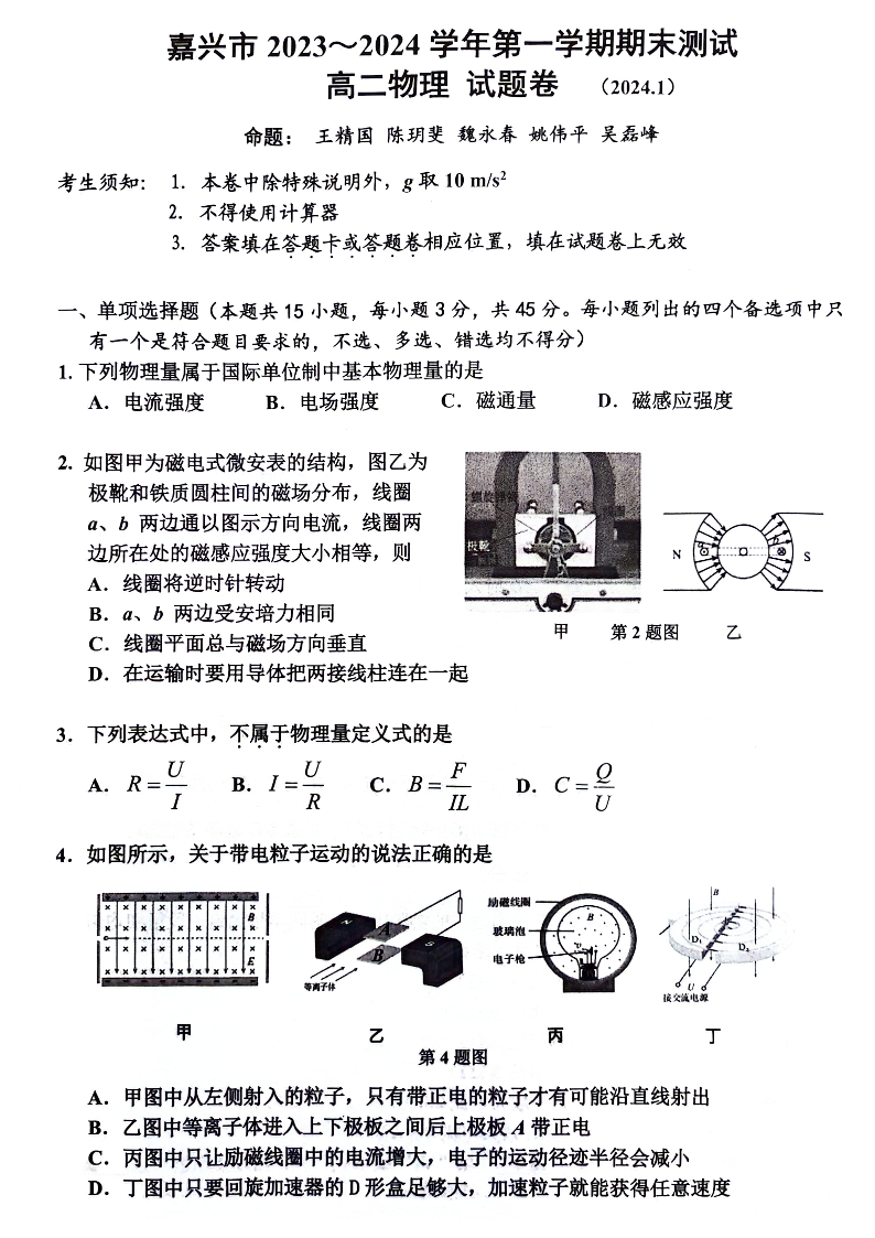 浙江省嘉兴市2023-2024学年高二上学期1月期末考试物理+答案