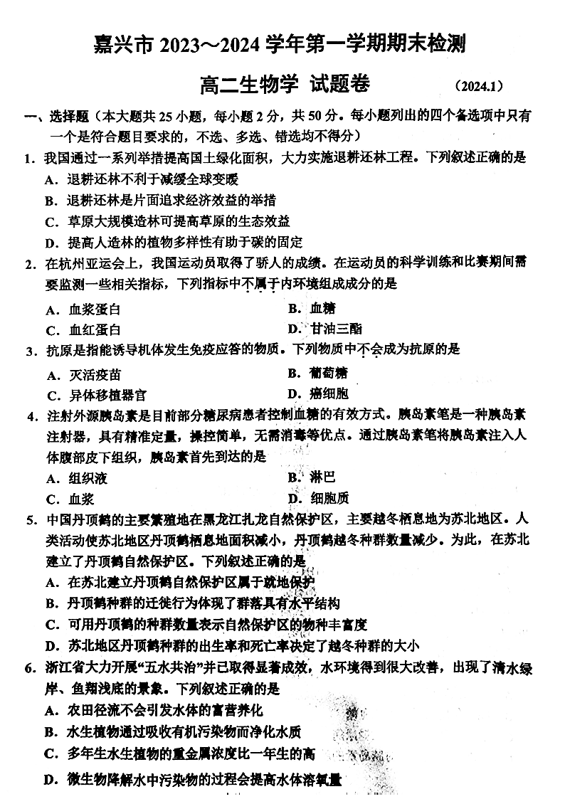 浙江省嘉兴市2023-2024学年高二上学期1月期末考试生物+答案