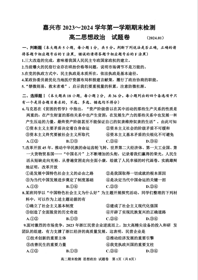 浙江省嘉兴市2023-2024学年高二上学期1月期末考试政治+答案