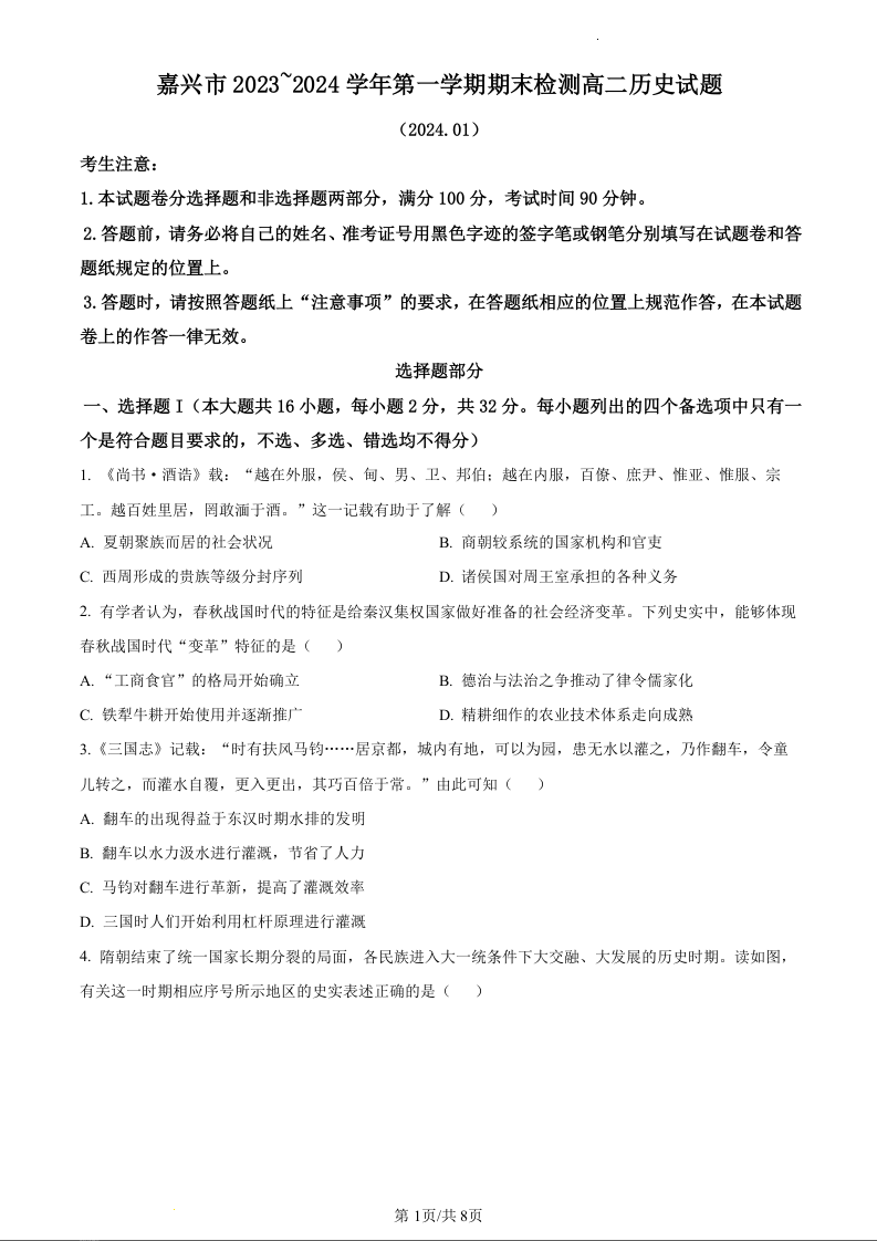 浙江省嘉兴市2023-2024学年高二上学期1月期末考试历史(原卷版)