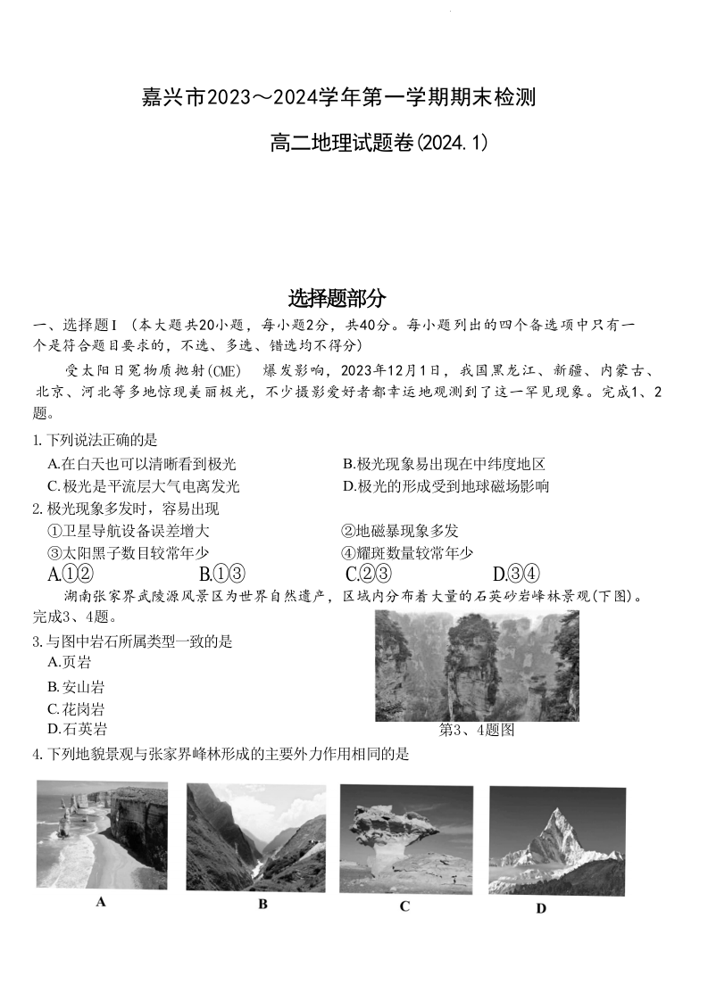 浙江省嘉兴市2023-2024学年高二上学期1月期末考试地理+答案