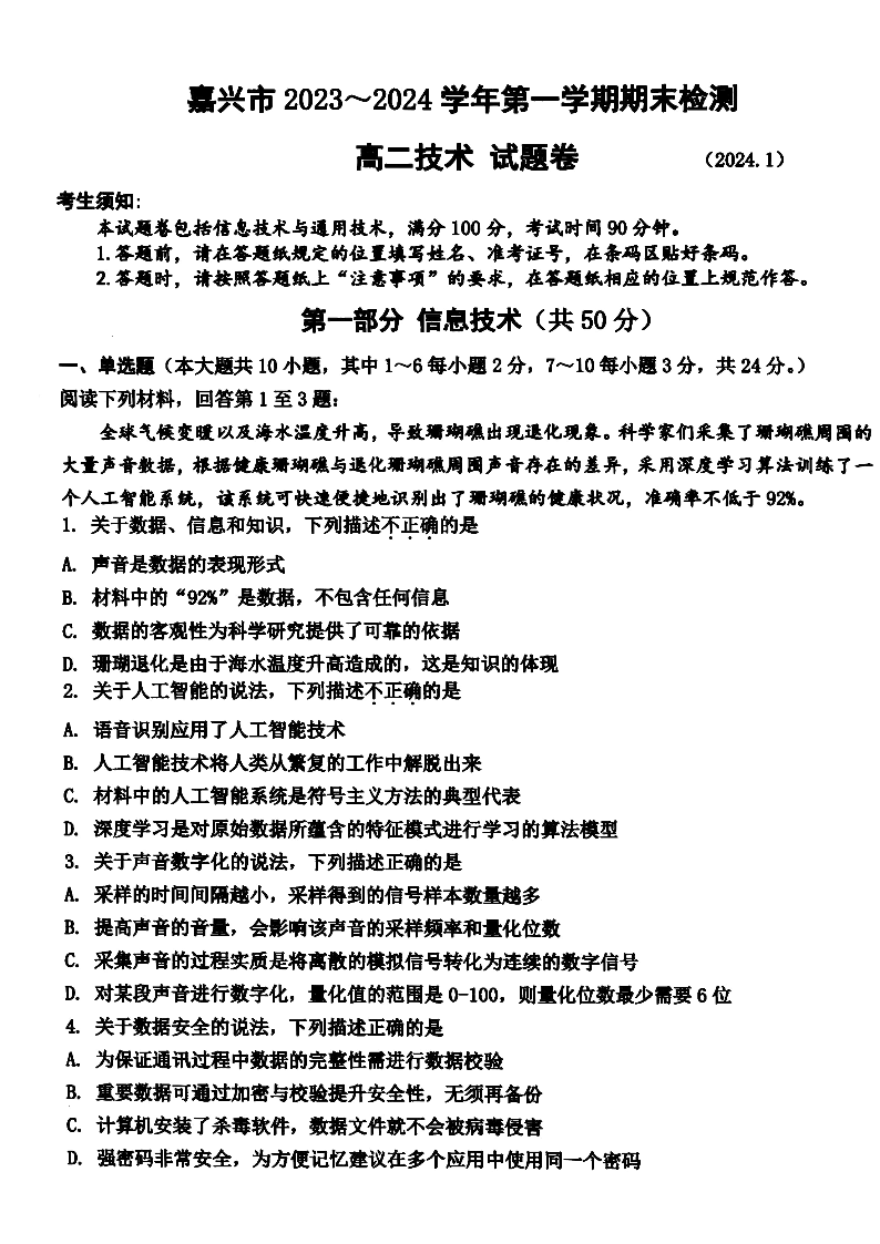 浙江省嘉兴市2023-2024学年高二上学期1月期末考试技术+答案