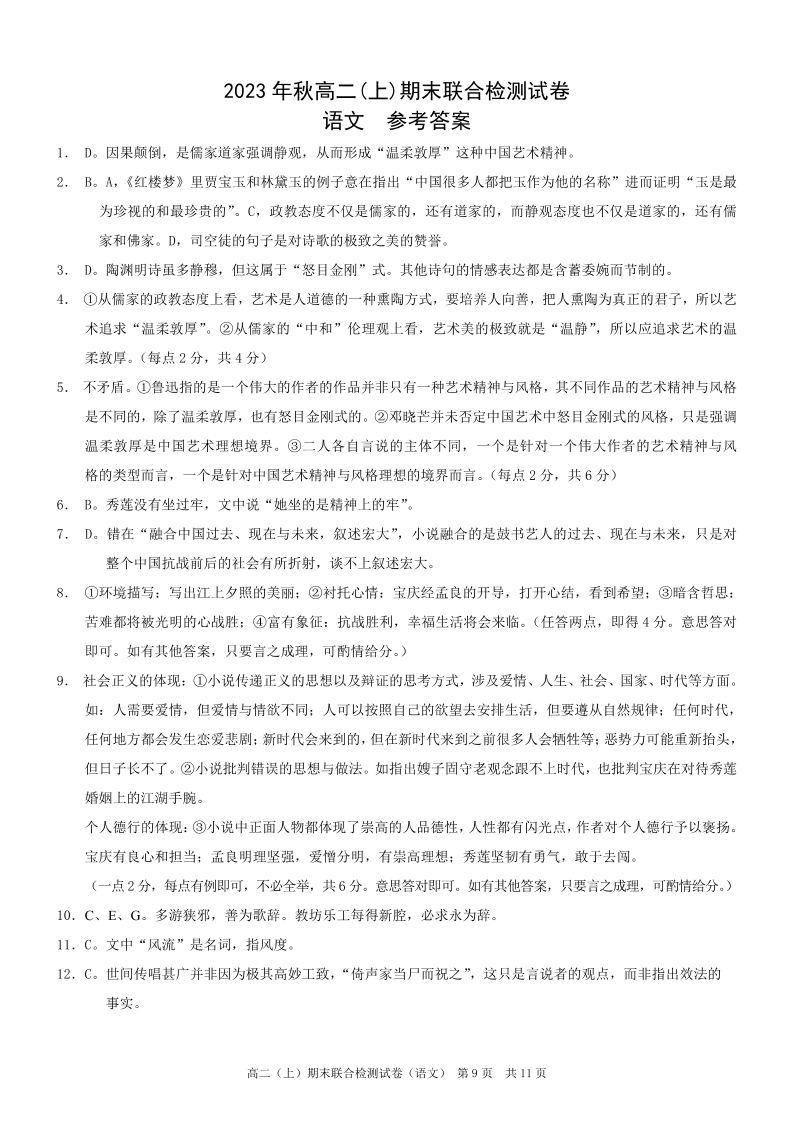 重庆市康德卷2023年秋高二(上)期末联合检测语文答案