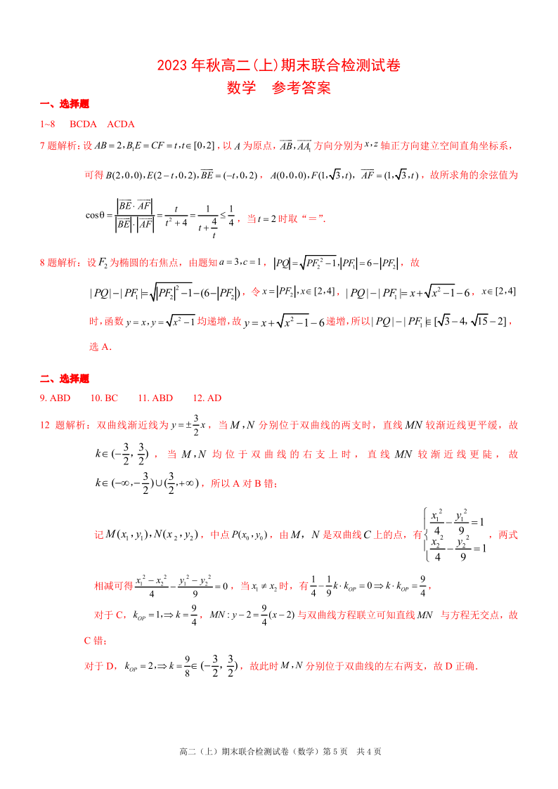重庆市康德卷2023年秋高二(上)期末联合检测数学答案