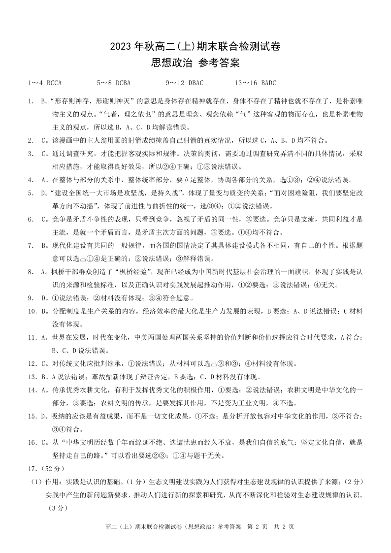 重庆市康德卷2023年秋高二(上)期末联合检测政治答案
