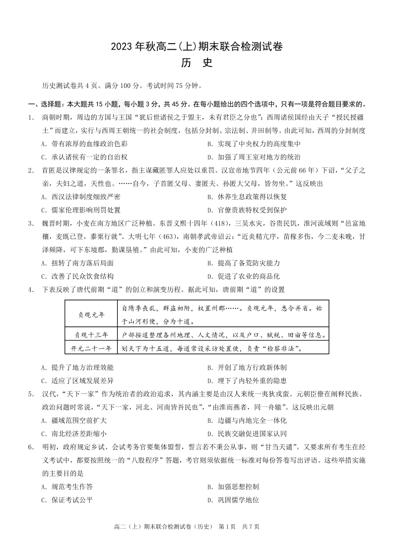 重庆市康德卷2023年秋高二(上)期末联合检测历史+答案