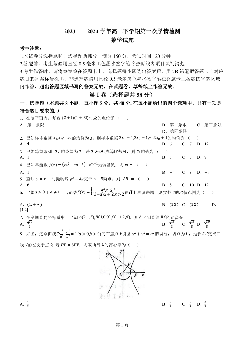 安徽省师范大学附属中学2023-2024学年高二下学期2月月考数学+答案