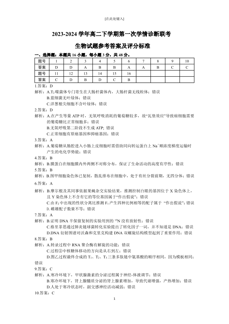 安徽省师范大学附属中学2023-2024学年高二下学期2月月考生物答案