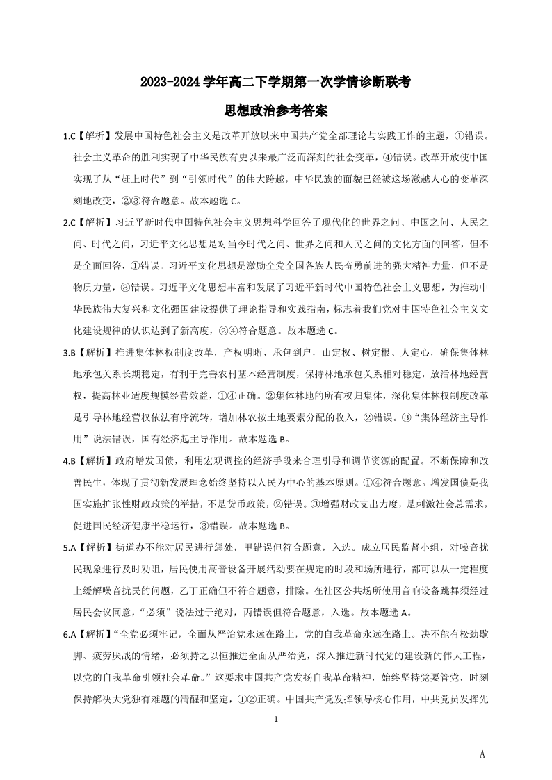 安徽省师范大学附属中学2023-2024学年高二下学期2月月考政治答案
