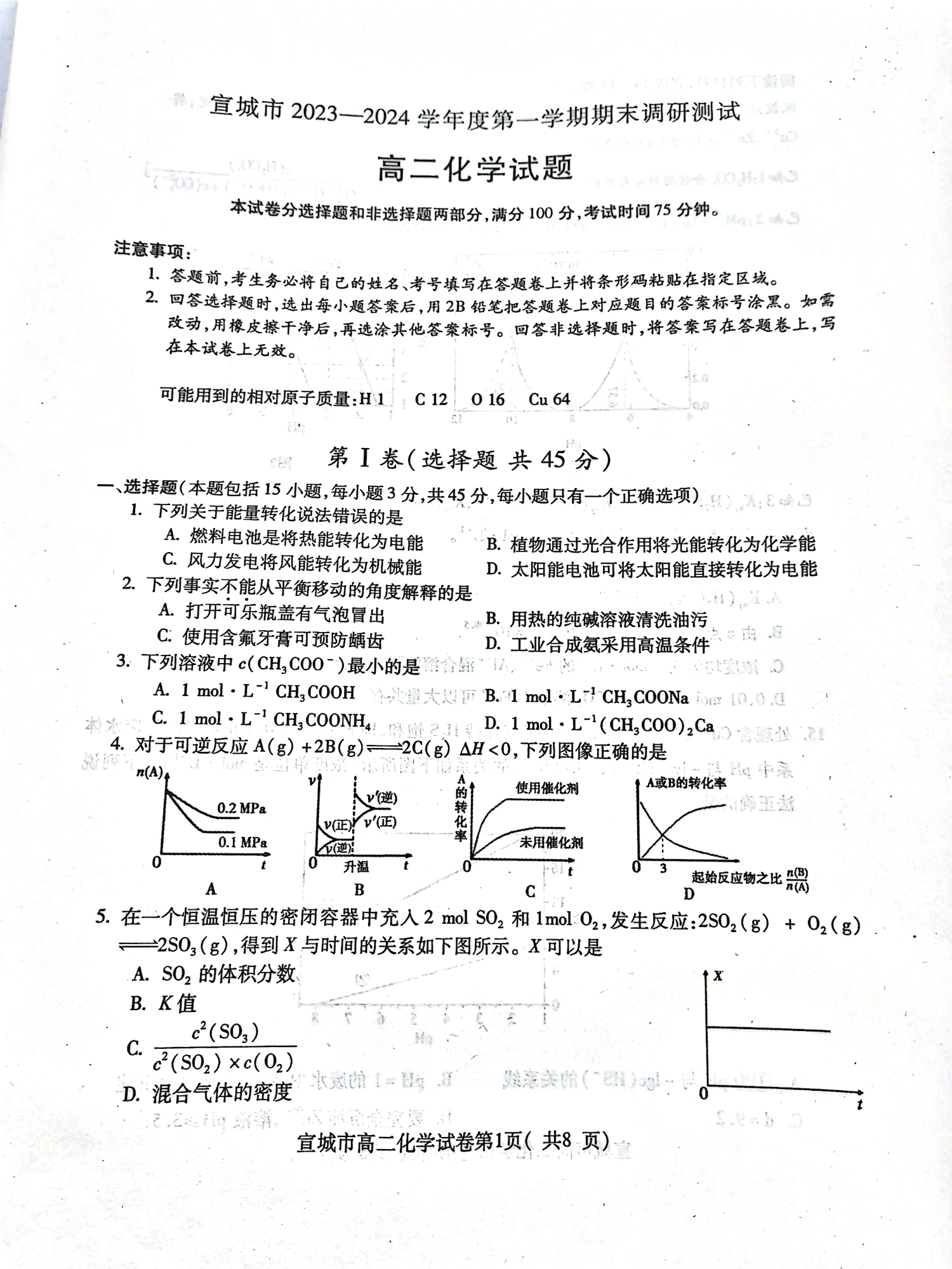 安徽省宣城市2023-2024学年高二上学期1月期末考试化学