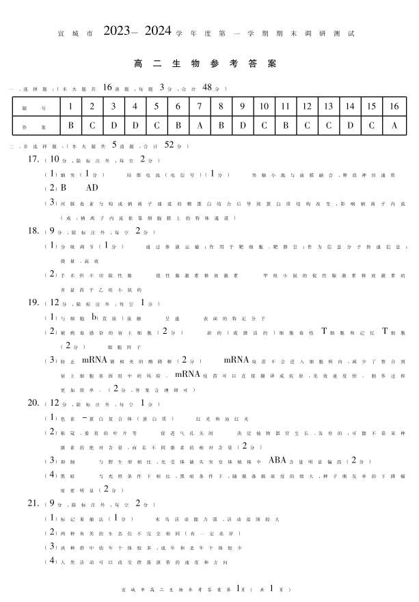 安徽省宣城市2023-2024学年高二上学期1月期末考试生物答案
