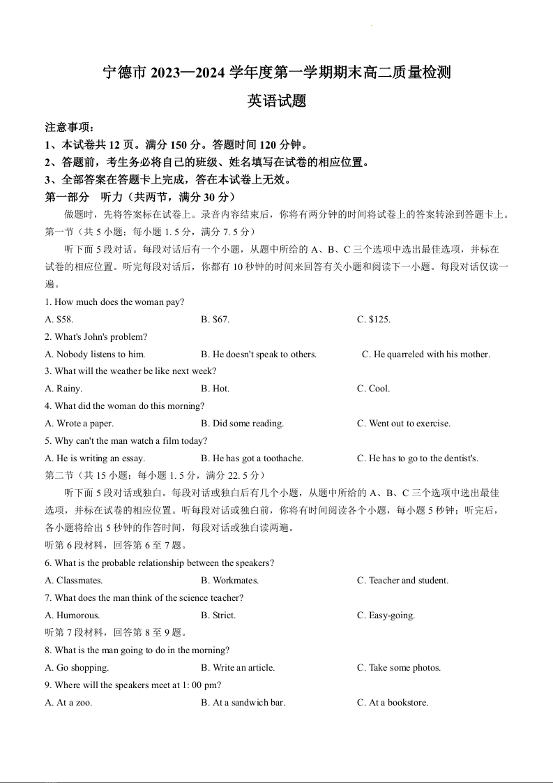 福建省宁德市2023-2024学年高二上学期期末质量检测英语
