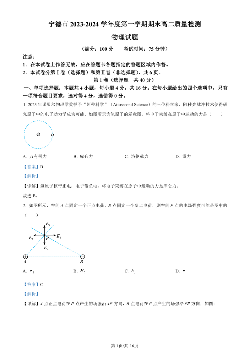 福建省宁德市2023-2024学年高二上学期期末质量检测物理(精品解析版)